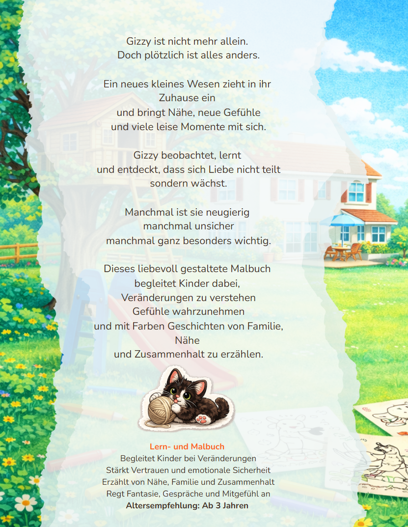 Gizzys leise Veränderung ist ein einfühlsames Lernmalbuch für Kinder von 3 bis 7 Jahren über Gefühle, Nähe und Veränderung. Es hilft Kindern dabei, neue Situationen liebevoll zu verstehen und ihre eigenen Emotionen spielerisch einzuordnen.